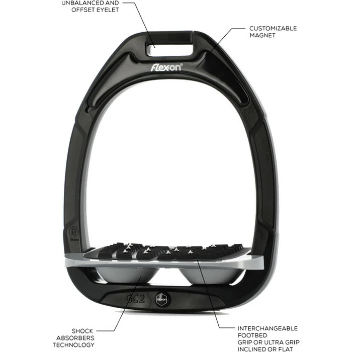 The GC2 stirrups, bestseller of the Flex-on range, combines comfort, personalization and performance. It helps to provide stability to the leg and enables perfect positioning of the rider. It ensures an improvement in technical performance thanks to its ergonomics and shock-absorption system. The colours of the customized product may slightly vary as we use computer-generated images.