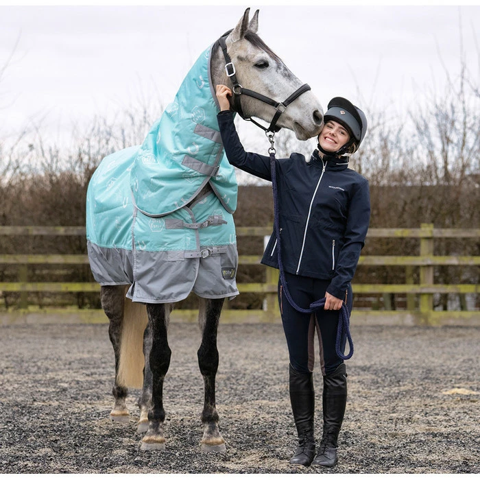 This versatile mediumweight turnout rug comes with a detachable neck cover so it can be tailored to the weather. Made from 600 denier with a ripstop and waterproof weave, this fabric is perfect for hard wear in the field. The 200g fill will keep your horse nice and warm in the changeable weather and the deep shoulder gussets allow for freedom of movement and comfort. This limited edition rug features the This Esme logo, horse shoes and horse silhouettes – perfect for any This Esme fan.