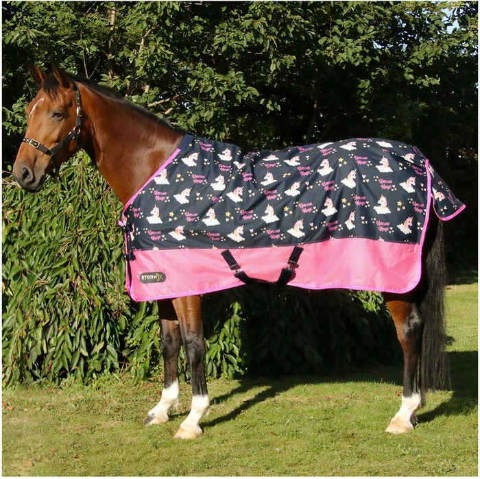 Stay magical with this fun StormX Original Unicorn Magic 0 Turnout Rug! This 600 denier waterproof and ripstop rug features no fill, perfect for when a lightweight rug is needed. Featuring unicorns and ‘unicorn magic’ slogan, with matching pink drip strip for an adorable look. Including fleece lined wither area to prevent rubbing and twin adjustable buckle chest fastenings, adjustable cross surcingles and adjustable leg straps to keep this rug securely in place. Perfect for any unicorn lover!