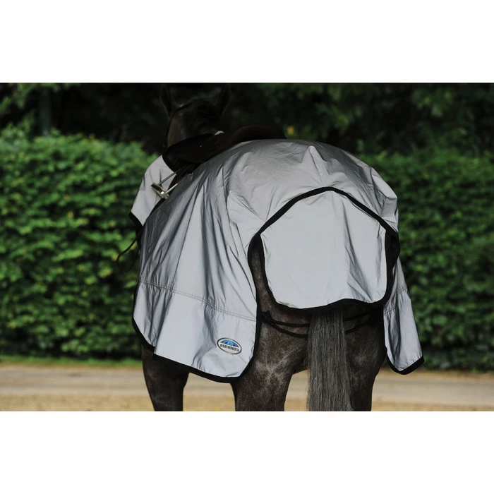 The WeatherBeeta Reflective Wrap Around Exercise Sheet is a showerproof and breathable exercise sheet with 210T polyester lining featuring all over reflective material, making it ideal for riding in poor visibility. Touch tape closures at wither and around the chest allow for an easy on/off. Tail flap and tail cord.