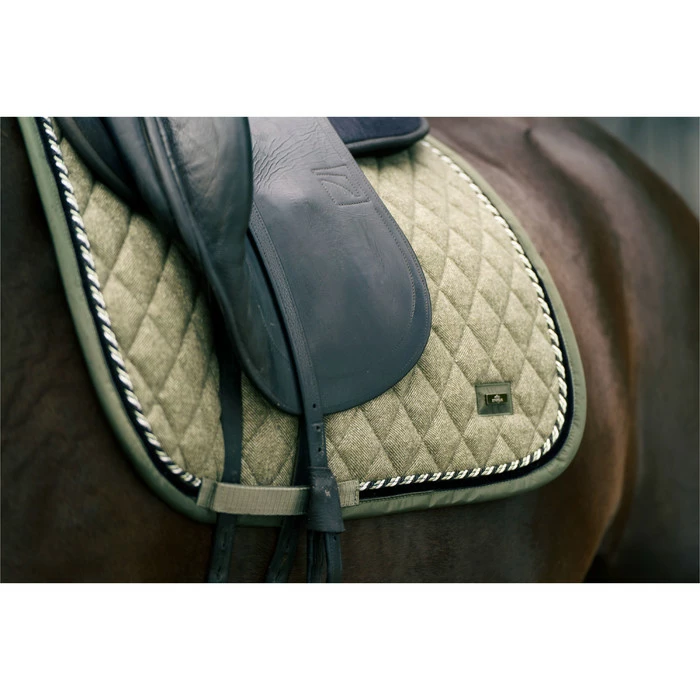 Saddlepad made out of wool material with a binding of fake memory. With small diamond quilting, a velvet tape and a fancy twisted rope along the binding. With a luxury embroidery at the backline and small metal plate with brand logo at the corner.
