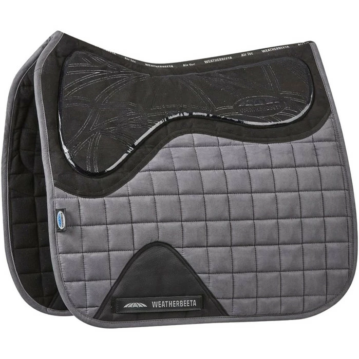 The WeatherBeeta Ultra Grip Dressage Saddle Pad features a silicone grip to prevent slipping and memory foam padding situated under the saddle for the ultimate comfort of your horse. The covered girth guard reduces excessive wear for added durability, and the suede fabric with a wick easy lining helps keep your horse cool, dry and comfortable. Longer shape to sit perfectly under a dressage saddle.